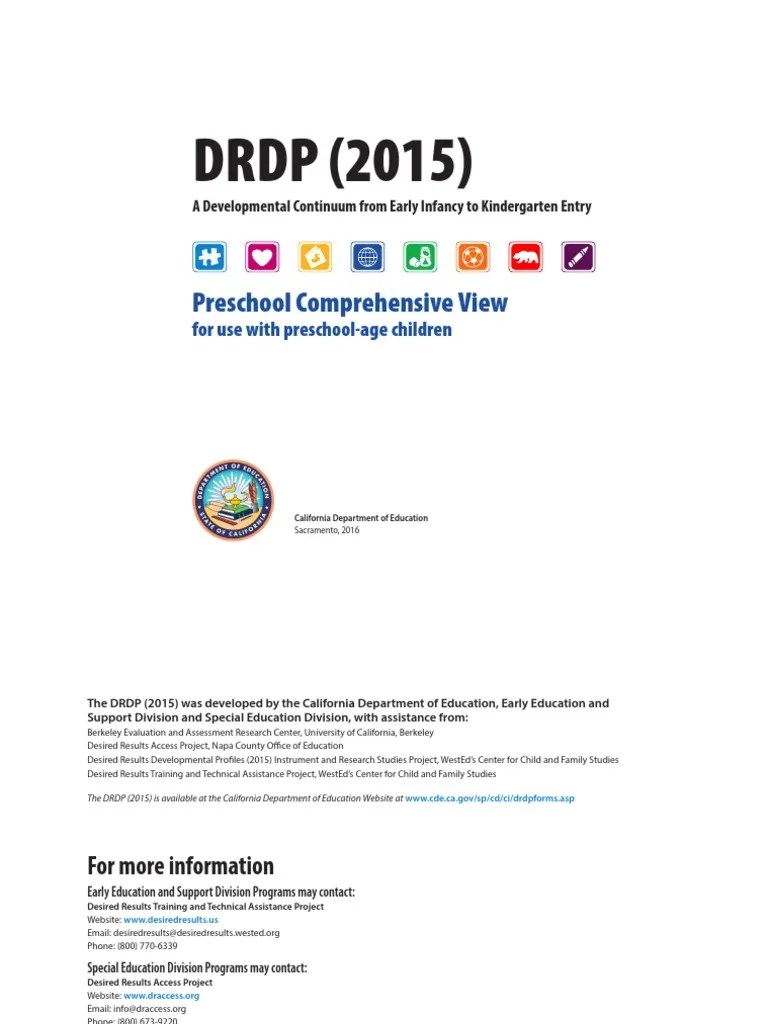 How many developmental domains are covered in drdp (2015) preschool fundamental view? There are three versions of the drdp (2015). A developmental continuum from early infancy to kindergarten entry. Drdp (2015) an early childhood developmental continuumpreschool comprehensive viewfor use with preschoolage childrenthe drdp (2015) was developed by the . A developmental continuum for kindergarten.